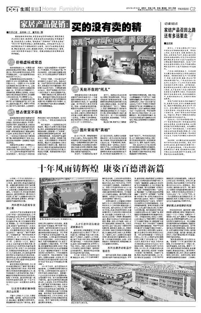 在康姿百德公司成立10周年之際,《中國消費(fèi)者報(bào)》2014年4月18日C2版,用1/2的版面對康姿百德公司10年來的發(fā)展情況進(jìn)行了客觀系統(tǒng)的報(bào)道。 報(bào)道從公司的科研成果、改革創(chuàng)新精神、人才引進(jìn)和團(tuán)隊(duì)建設(shè)、主題活動(dòng)、未來憧憬等方面,反映了公司成立10年來所取得的一系列驕人業(yè)績和公司發(fā)展過程中形成并堅(jiān)持的品質(zhì)精神、價(jià)值理念、管理運(yùn)營模式。這是該報(bào)為公司10周年華誕送上的一份大禮,必將激勵(lì)全體康姿百德人在新的起點(diǎn)上振奮精神、開拓進(jìn)取,取得新的更大的業(yè)績。