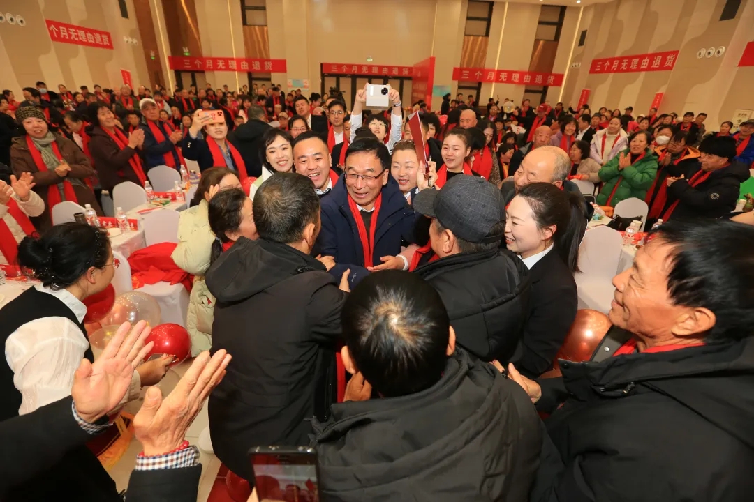 活動(dòng)現(xiàn)場,銷售公司的領(lǐng)導(dǎo)們早已等候在紅毯兩側(cè),笑容滿面地為每一位步入會(huì)場的“家人”親自系上象征吉祥與溫暖的紅圍巾??底税俚录瘓F(tuán)李銀祥董事長的到來,更讓現(xiàn)場瞬間沸騰,客戶們紛紛揮手致意,掌聲與歡呼聲交織成一片,將慶典的喜悅氛圍點(diǎn)燃。